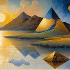 Golden autumn, owl at the water, reflection, trees, sunset, mosaic, patchwork