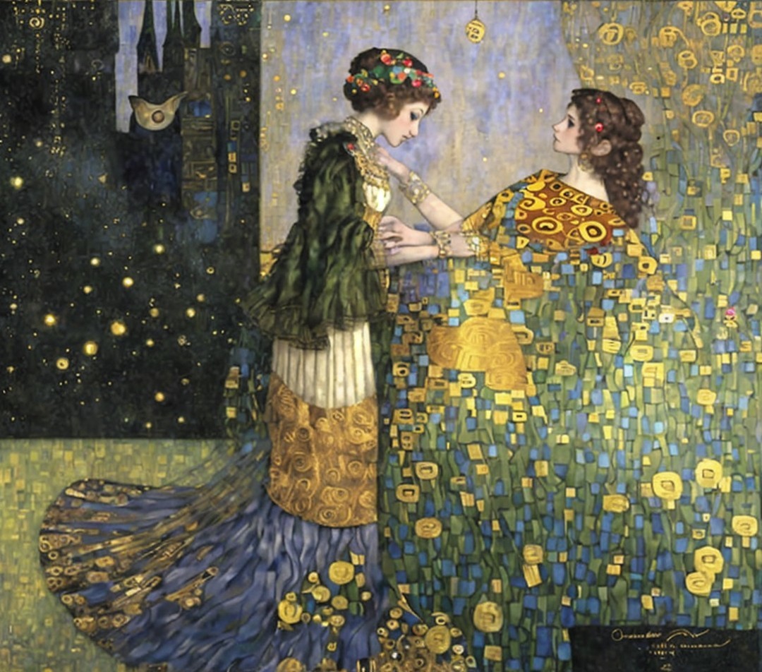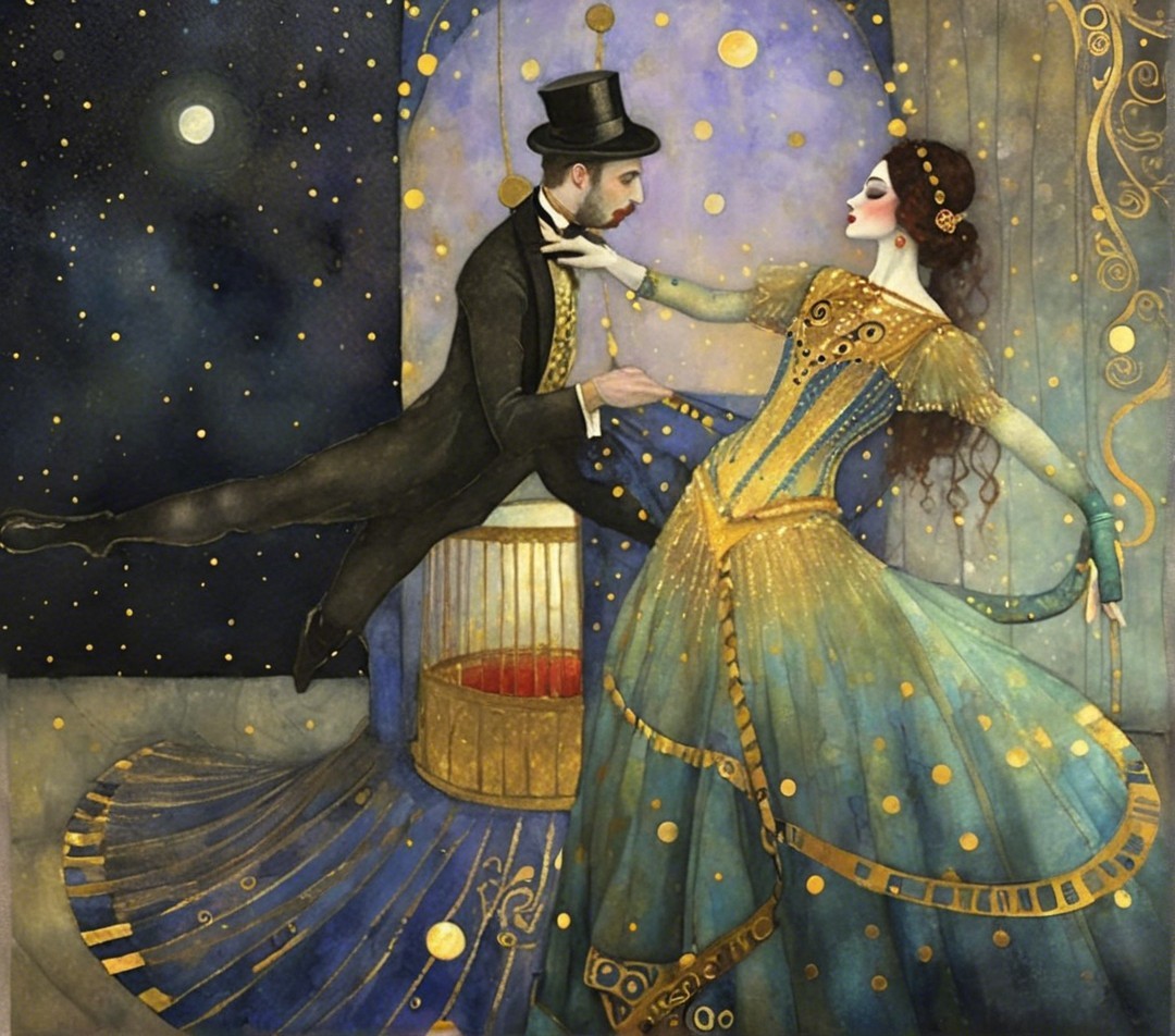 A gracefully dressed couple dances in a moonlit setting, adorned in elegant attire. The man in a top hat extends his hand, while the woman in a flowing gown embodies grace and poise.