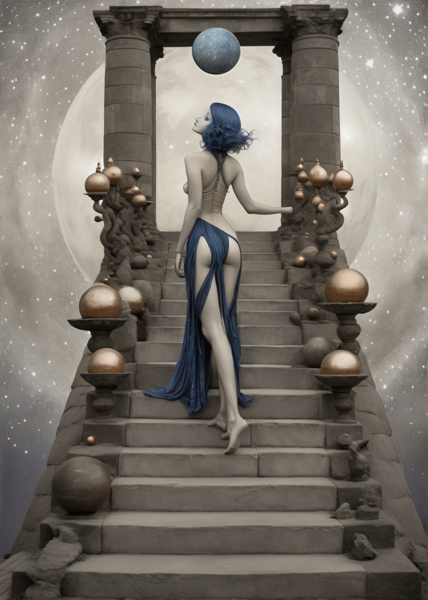 An artistic depiction of a woman adorned with celestial bodies, walking among planets against a starry backdrop, embodying a cosmic theme.