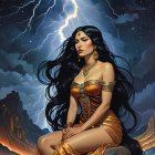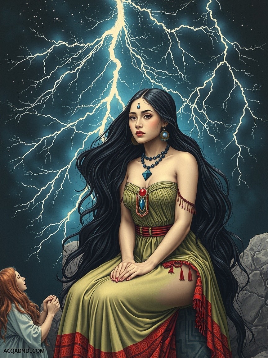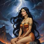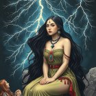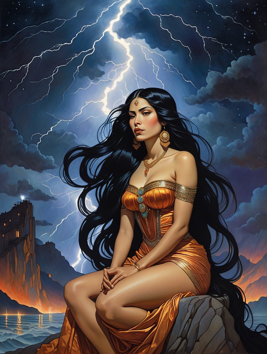 Guatemalan woman with Long flowing black Hair, sitting in front of lightning , stardust, Style: Möbius, Daniel Merriam, Egon Schiele, Alphonse Mucha, Anna Dittman, illustration