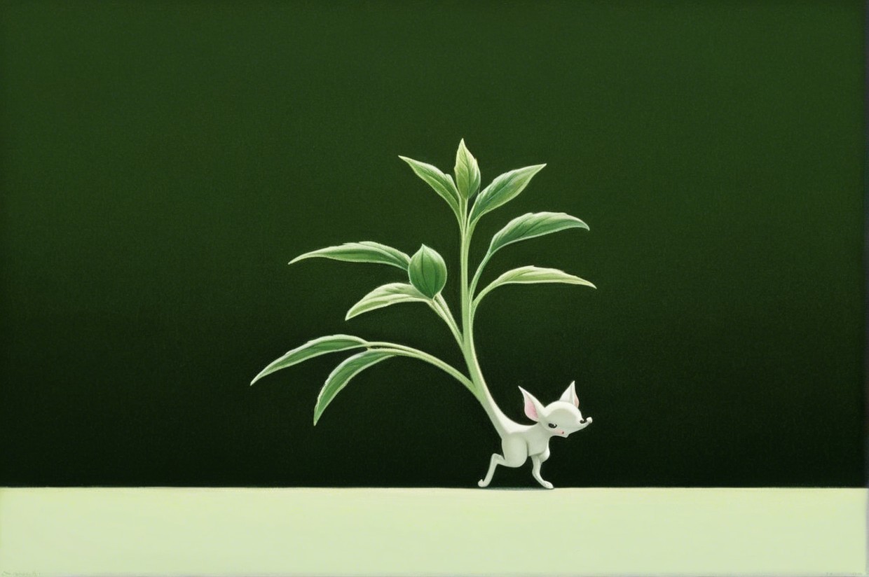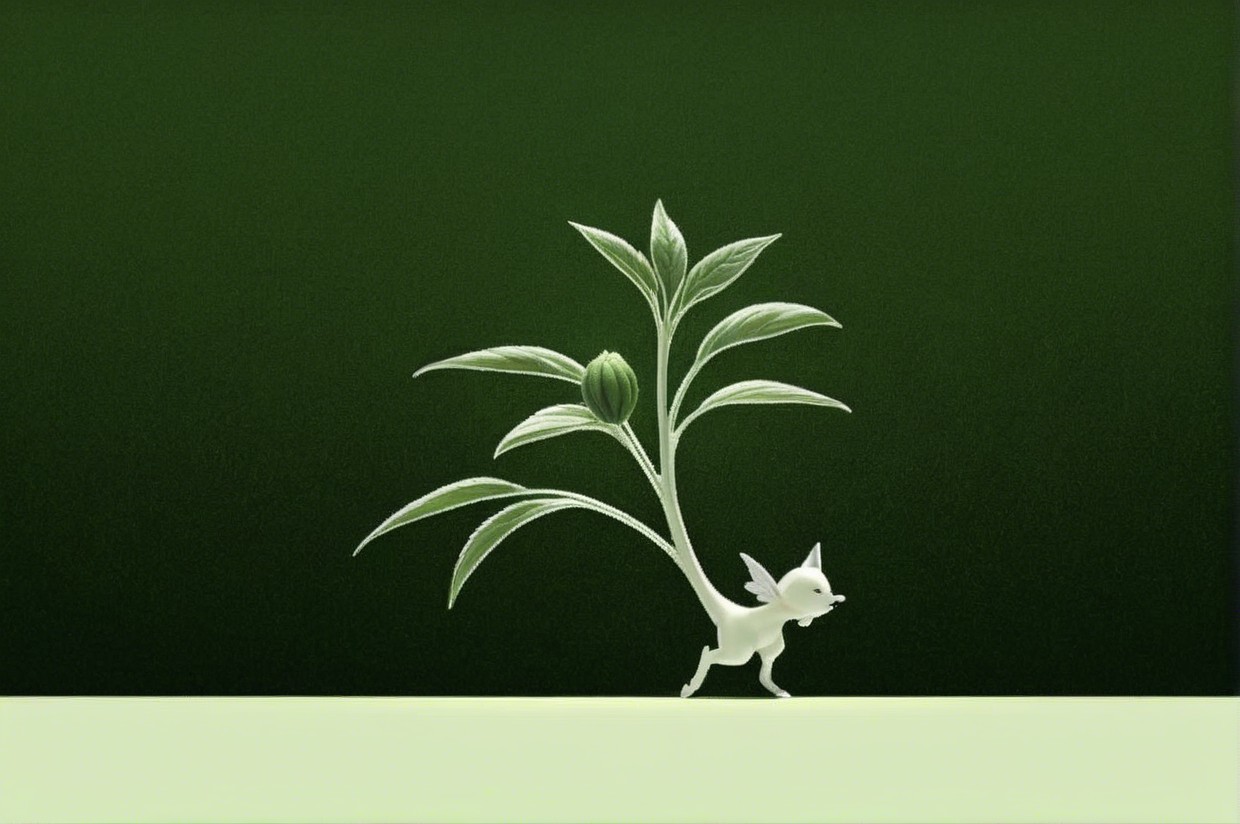 A whimsical scene features a small white mouse with large ears, supporting a tall green plant adorned with a butterfly at its top, set against a deep green background.