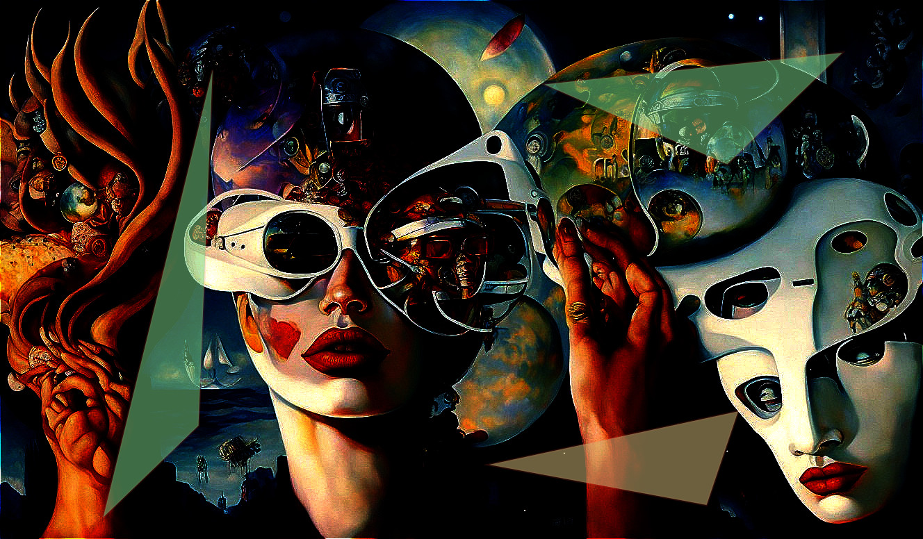 A futuristic artwork featuring two figures in high-tech goggles, surrounded by mechanical elements and surreal landscapes. The image blends human and machine, showcasing a vibrant, imaginative vibe.
