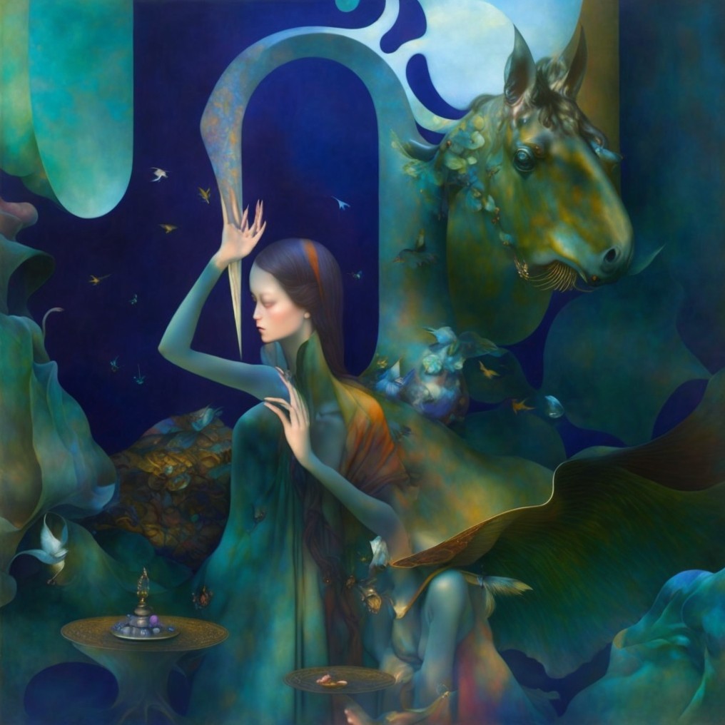 A dreamlike landscape filled with glowing lotus flowers, ethereal mountains, and shimmering waters. Soft blues and greens create a serene atmosphere, inviting tranquility and reflection.