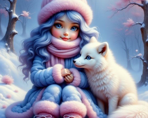 A stylized illustration of a girl in Victorian steampunk attire with a horse in a stable.
