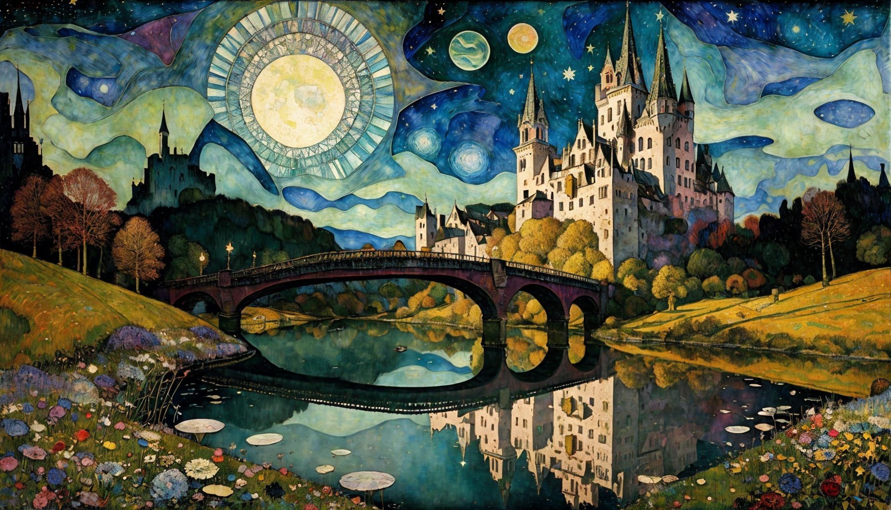 Prompt: bridge and castle by lake under cosmic sky, by Egon Schiele, Paul Klee mixed media, depth of field, parts of background made out of glass shards, metallic ink details and realistic textures created by Dave McKean and Richard Corben