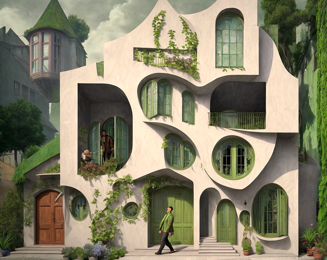 Prompt: "A man in a green jacket walks past the architect's strange house, blocks in various colors, large colorful windows, curved stone exterior stairs on the side of the house, jugs, bags and utensils stand in front of the house, plants, bushes, inspired by Remedios Varo, highly detailed"