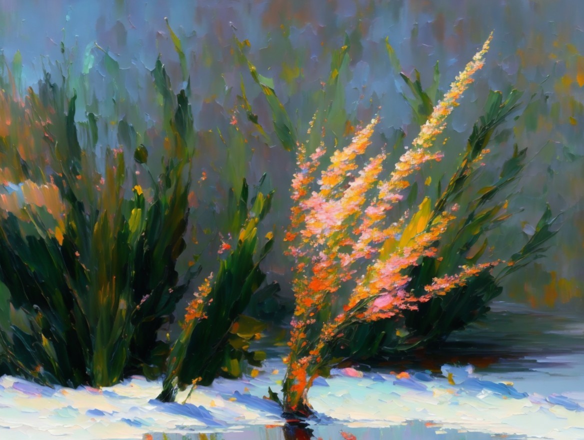 A vibrant oil painting of colorful flowers with impasto strokes, suggesting movement and life amidst a blurred, dreamy background.
