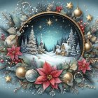A picturesque winter scene featuring a decorated Christmas tree in the foreground, a cozy cottage with light in the window, and majestic snowy mountains under a bright moonlit sky.