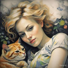 A serene portrait of a young girl with wavy blonde hair, gazing softly alongside a ginger cat. Surrounded by lush greenery and delicate flowers, the scene exudes a warm, nostalgic feel.