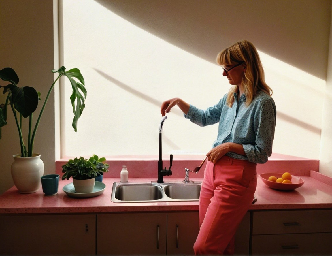 A woman in a skirt and blouse stands by a window, adjusting a tap with a black cat watching near a sunlit sink.