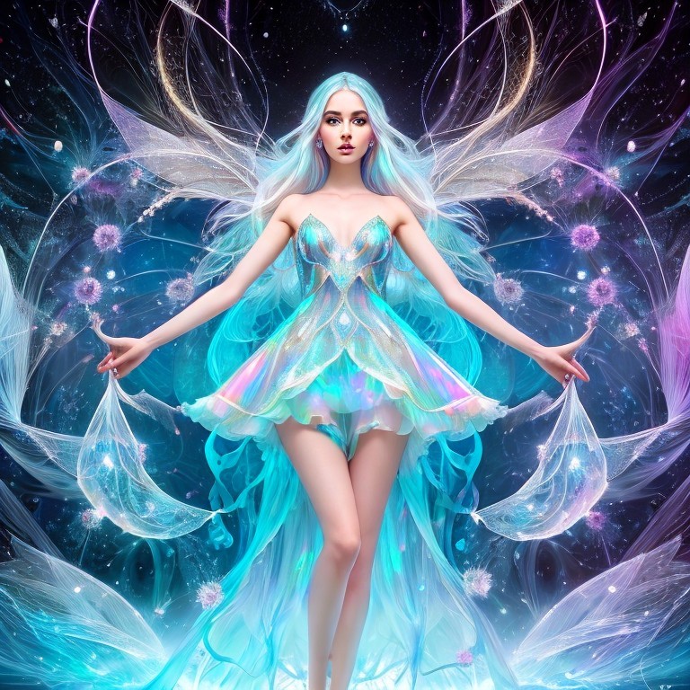 Prompt: Captivating surrealism & fantasy, lanky beautiful waif whose skin is an exquisite shimmering iridescent opal, is in an exaggerated dynamic pose that engages her entire body, wearing a dress crafted of surreal opalescent dandelions, both glassy & wispy, fitted & fluidly buoyant, depiction includes woman’s full head & entire body including arms & legs & ethereal, sensuous, mesmerizing fluid dress-in-motion artistic masterpiece – all portrayed on the screen, she twirls in & with her amazingly flowy silky wispy dress which generates incredible billowing dramatic aesthetically resonating dynamic designs + wispy dandelion motifs + undulations + Moire silk designs with seamless fluidity, & high internally decorative aspects, ethereal visual designs & optical illusions & kinetic fluidity, reverberations immersive detailed background that is an expansive extension of her dress, visible morphing, intricate detailed line work, integrated diverse textures, dynamic, igorot woven textile patchwork by eniki bial & Jeremy mann & Anna Dittman & Paul Klee & & Hans Hartung & Mark Rothko & Dee Nickerson & Scott Uminga & Victor Vasarely & Anthony Hill, Oleg Shupliak assemblage art remarkable intricacies, precision, unconventional aesthetic & kinetic vision hyper detailed, otherworldly beauty, ,internally decorative, perfect body coordination perfectly flowing emotions perfectly resonated aesthetics show objects in great details and accuracy Legit emotional reactions opalescent prismatic colors, sheen,