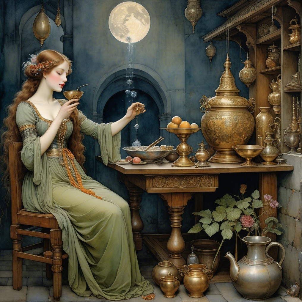 A serene woman in a flowing green gown sits at a wooden table adorned with golden pots and fruit. The room's rich hues and soft light create a tranquil, timeless atmosphere.
