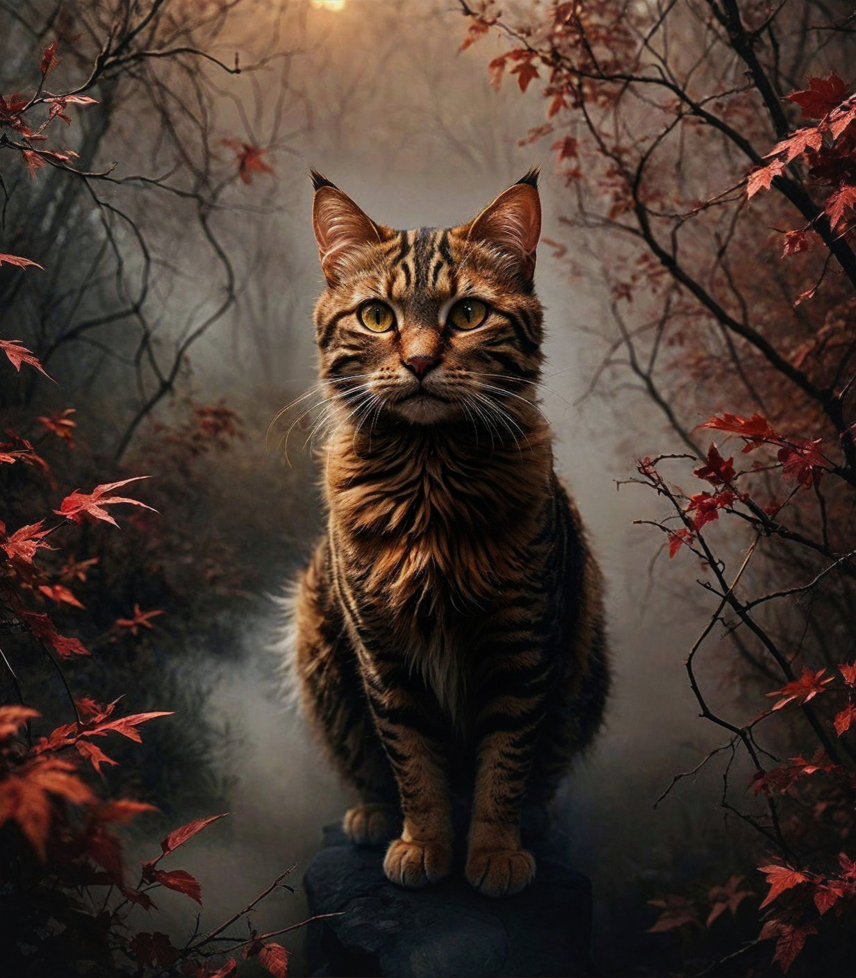 A majestic striped cat sits regally on a rock amidst autumn foliage. The soft light filters through the misty background, enhancing the cat's striking green eyes and vibrant fur.