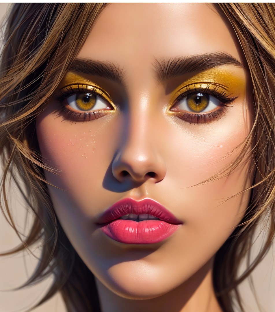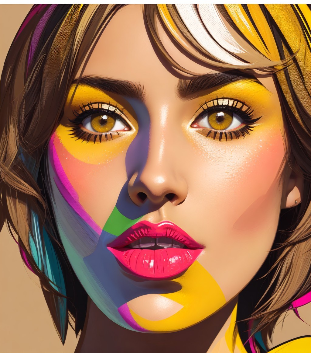 Stylized Portraiture, style of Kaia Coopman, brightness 1.9, bold strokes, impasto, frottage, wavery texture patchwork, vibrant colors, close up, encaustic strokes, cel-shaded illustration, intricate skin texture, triadic colour scheme beige yellow brown,