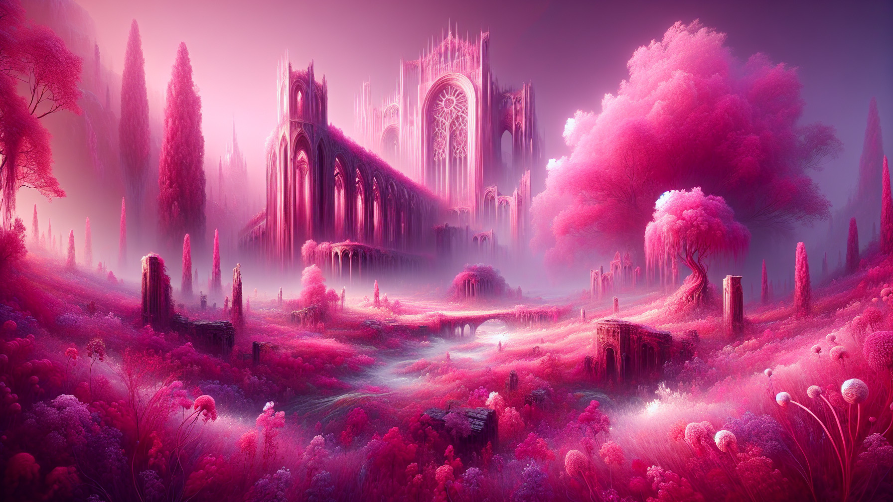 In an enchanting landscape, a grand gothic cathedral towers amid vibrant pink blossoms and lush greenery, illuminated by a soft glow, evoking a dreamlike, serene atmosphere.