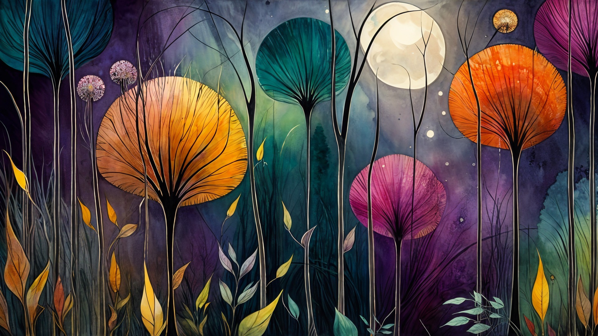 Very grateful thanks and credit to E. Teach, for a superb dream and the try-it option. A whimsical, coloruful landscape featuring stylized, vibrant trees in shades of orange, green, and white, surrounded by a dreamy, starry, background and illuminated by soft orbs of light.