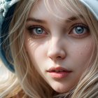 A close-up portrait of a young woman with striking blue eyes. She wears a light hoodie adorned with frost, creating a serene and wintery atmosphere. Her expression is calm and captivating.
