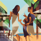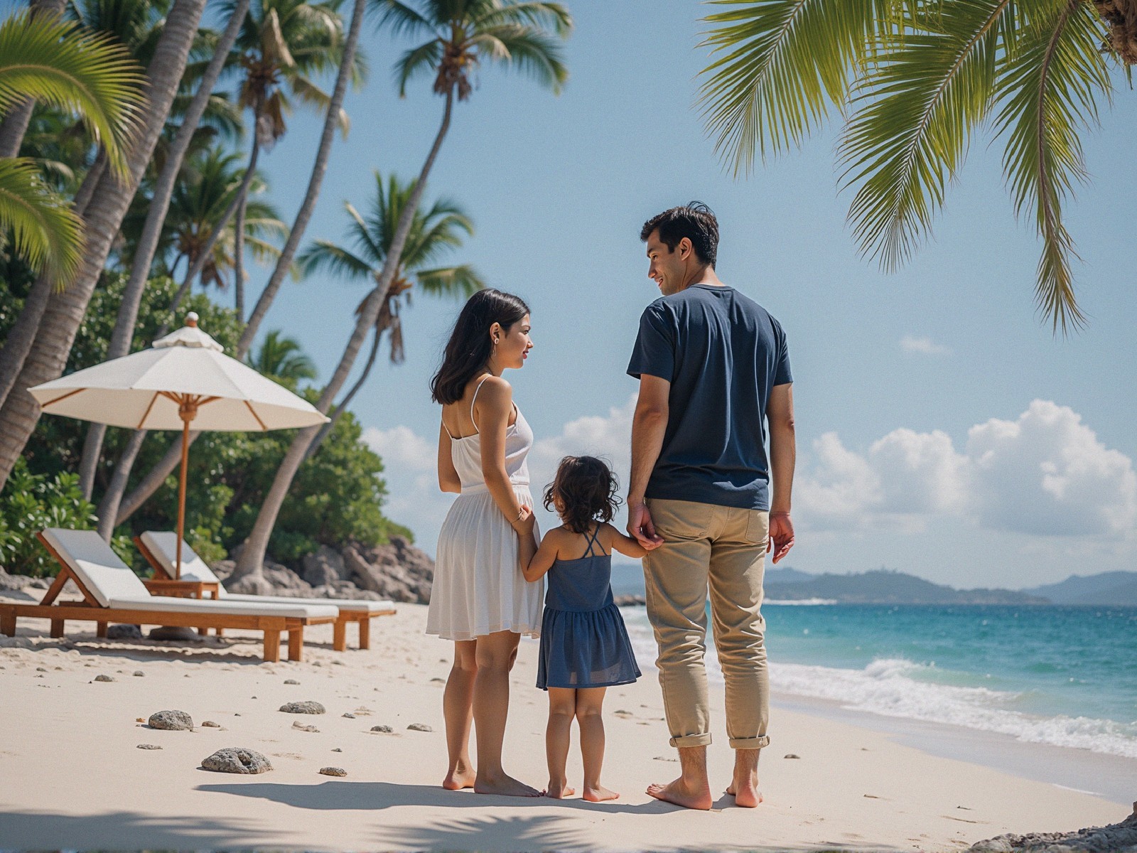 A full shot of an Asian family, from the back, on a beach in a tropical setting with palm trees, a lounge, and a large umbrella on a bright, sunny day. The family consists of a woman in a white dress, a man in a navy t-shirt and tan pants,