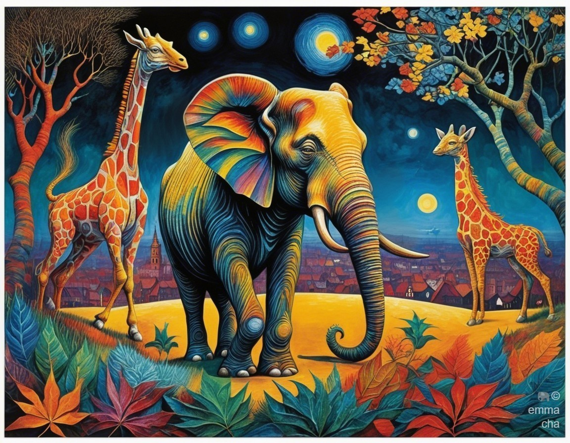 A surreal scene of an elephant and two giraffes bathed in vivid colors under a starry night sky. Surrounded by oversized, colorful leaves, the animals stand on a hill overlooking a distant village. The artwork fuses fantasy with nature, creating a dreamlike, magical atmosphere.
