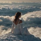 A serene woman in a flowing white dress sits gracefully on soft clouds, gazing into the distance as the sun sets, casting warm hues over a dreamy sky filled with clouds.