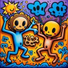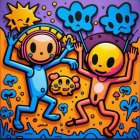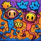 A playful cosmic duet of cheerful figures and their feline friend. The simplified geometry and electric palette merge digital innocence with surreal rhythm—an anthem to naive happiness where color, form, and sound pulse as one.