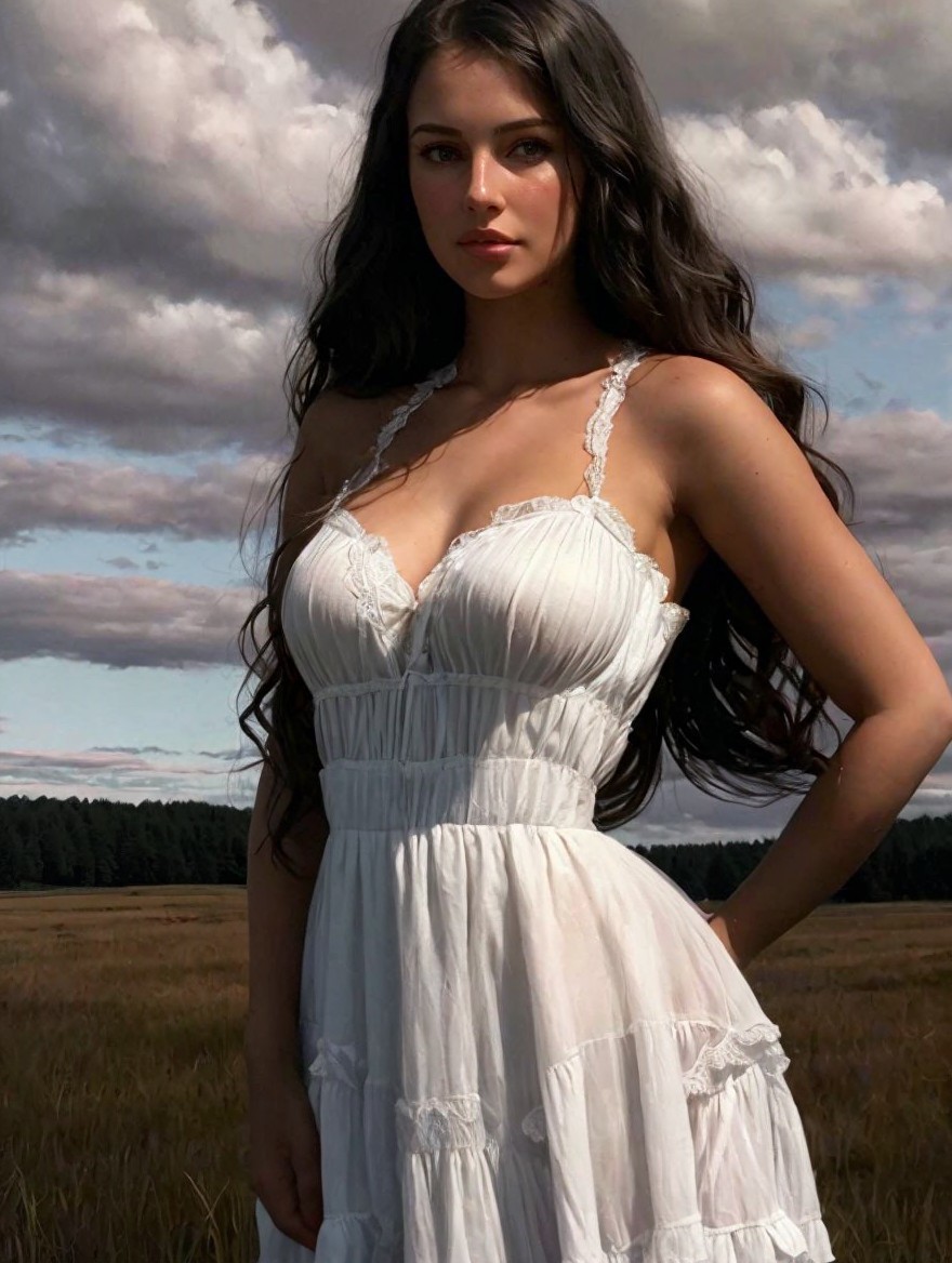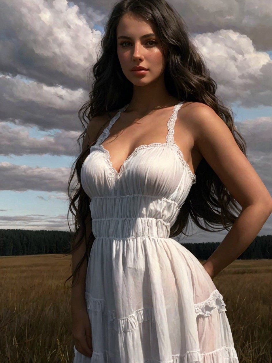 A young woman stands in a field, wearing a flowing white dress. Her long, wavy hair cascades down her shoulders, and the cloudy sky provides a soft, dramatic backdrop to the scene.