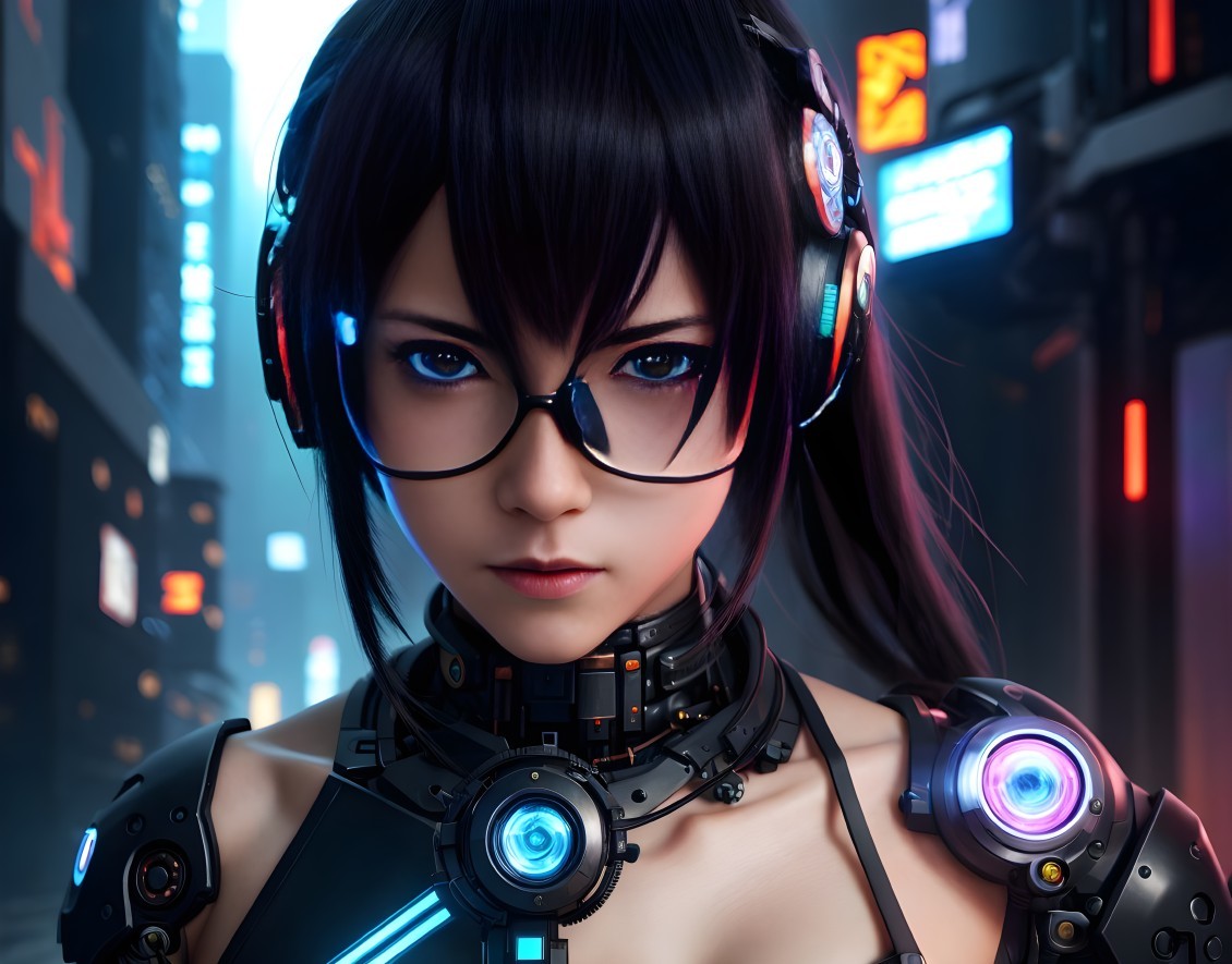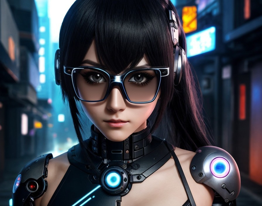 Anime cyborg girl with human head and mechanical cyberpunk body. Full body. Laser eye in left.