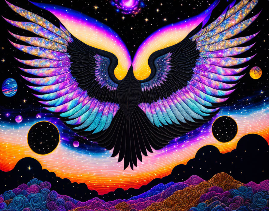 Prompt: "Patchwork Patty sewing together the magic vision path. Surreal. Black and white with sporadic streaks of brilliant color. Incredibly detailed and ornate. Mighty Phoenix's black silhouette in a sunset sky overlooking outer space"