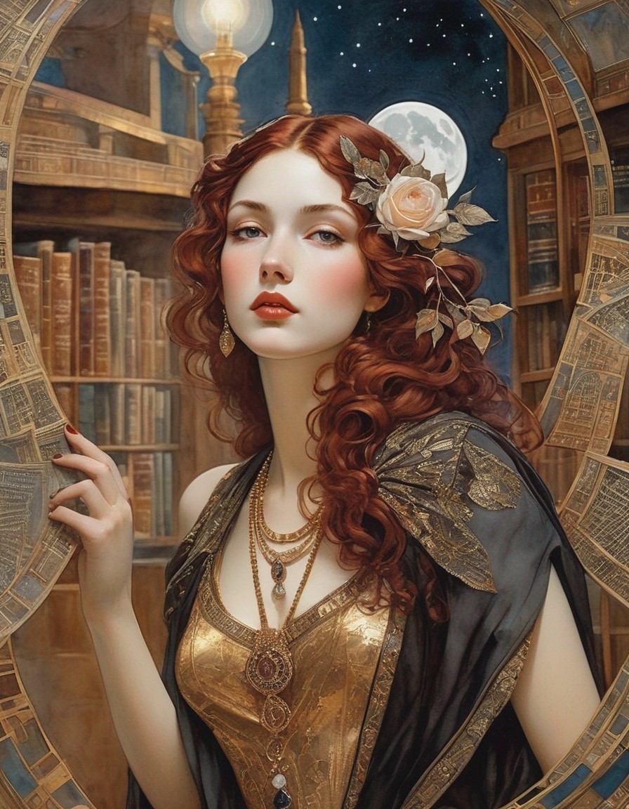 Woman with Red Hair and Dress Surrounded by Books in Night Cityscape