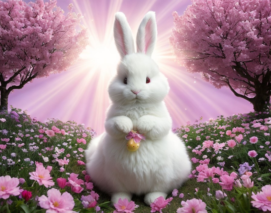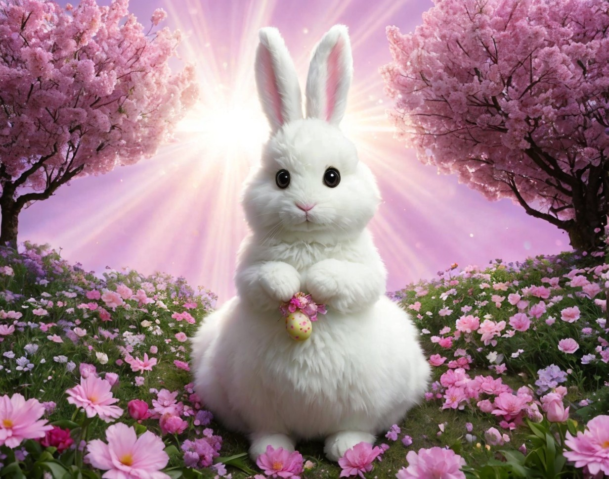 151515·Photograph capturing a playful moment a fluffy Easter bunny against a backdrop of blooming flowers, lens flare effects reminiscent of Annie Leibovitz's style, vibrant colors, hyperrealistic details, 8k resolution.[blending Junji Ito's horror with Robert Oxley's mastery, Gazelli's uncanny touch, and M.W. Kaluta's surrealism. Featuring mixed brush strokes, paint splatter, and drip painting, creating a masterpiece in 8k resolution, trending on ArtStation]{The high-resolution, photorealistic quality captured with a Nikon Z9 and 85mm F1.2 lens enhances the intricate details and hues of the composition}