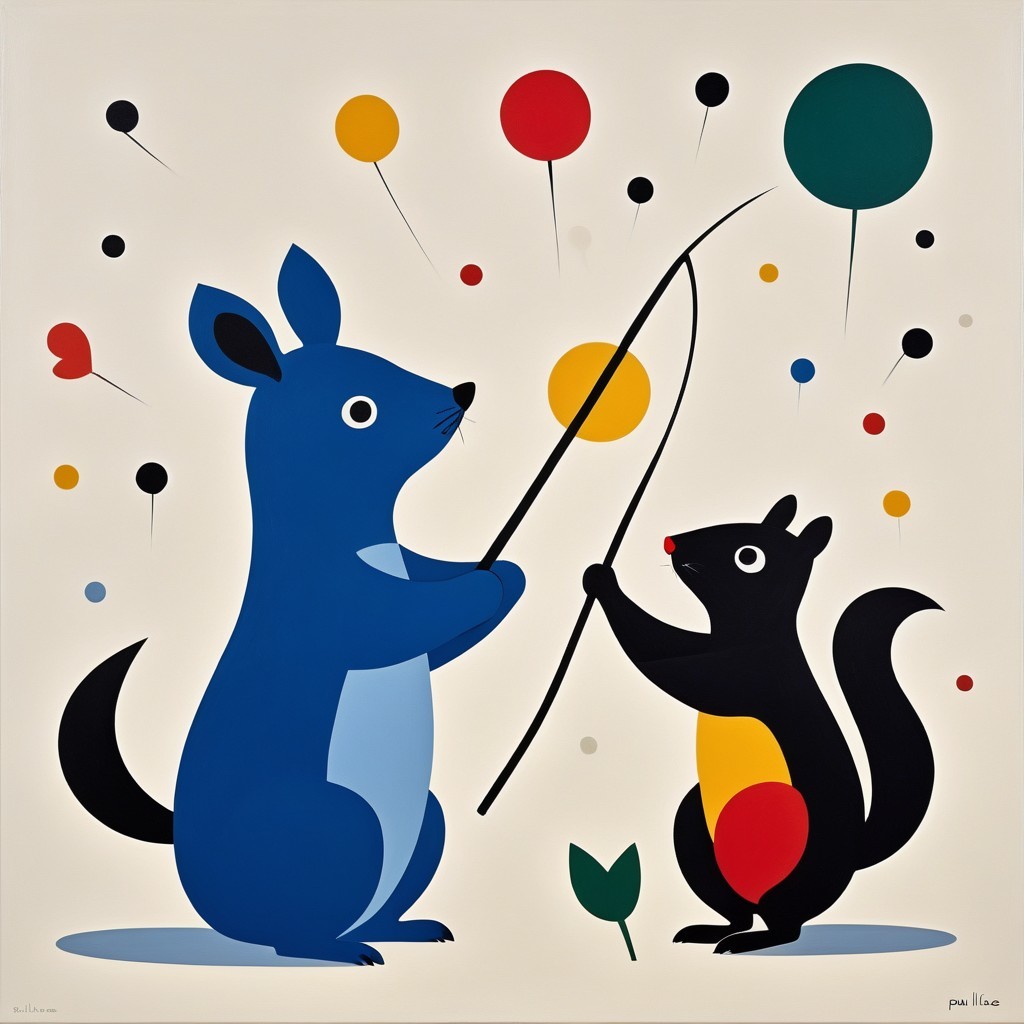 A playful blue rabbit and a cheerful black squirrel are joyfully holding colorful balloons, surrounded by vibrant dots and simple greenery, creating a whimsical, lively scene.