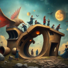 A surreal scene featuring a fantastical building with a giant bird and characters in historical attire. The sky is vibrant with planets and flying creatures, blending magic and whimsy.