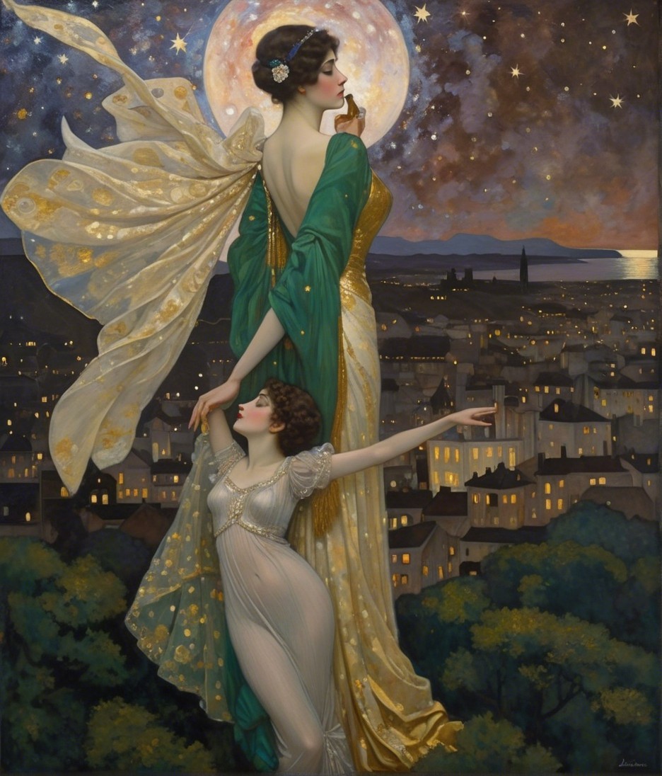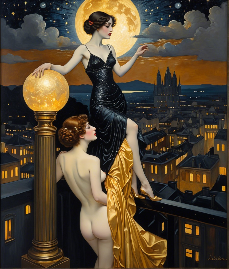 The artwork features two elegant women against a moonlit Parisian skyline. One in a glamorous black gown stands confidently, while the other, partially draped, gazes thoughtfully, creating a dreamlike atmosphere.