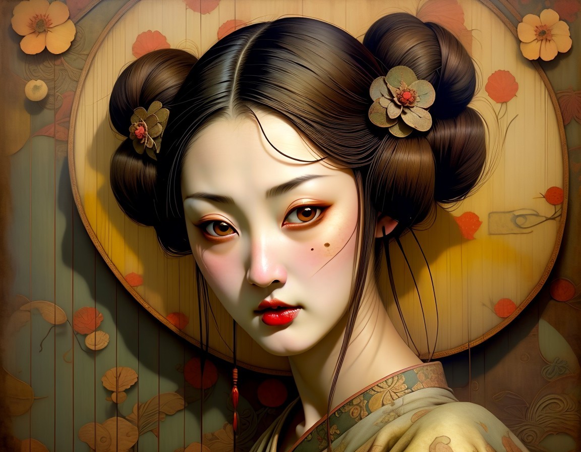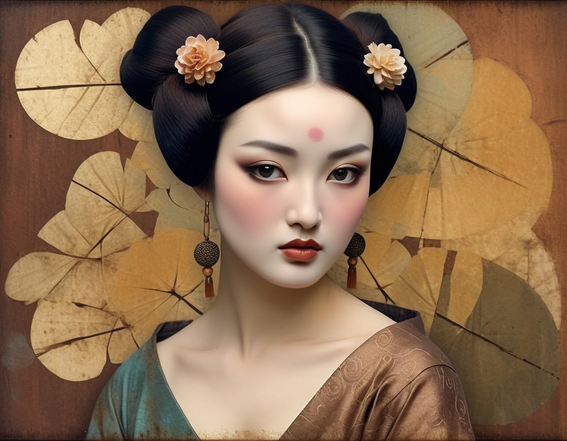 A portrait of a woman with a traditional Japanese hairstyle adorned with golden hairpieces and an orange flower, set against a textured floral background, exuding elegance and tranquility.