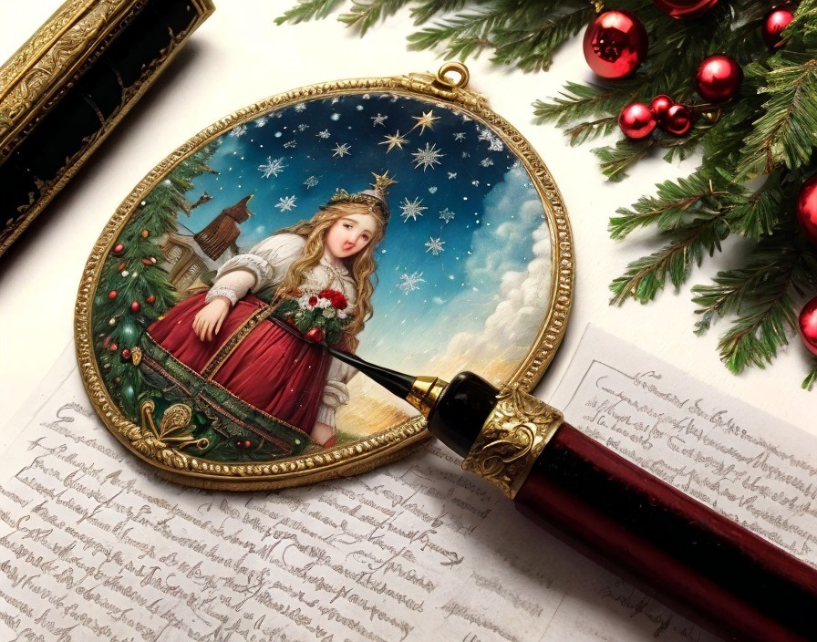 A song writer penning "The Twelve Days of Christmas" with the images of each Day coming out out of his 18th century pen, heavy drip painting with lots of texture, in the style of whimsical absurdity, extremely detailed art, illuminated visions, realism with surrealistic elements, neo-mosaic, highly detailed illustrations, anatomically correct hand.