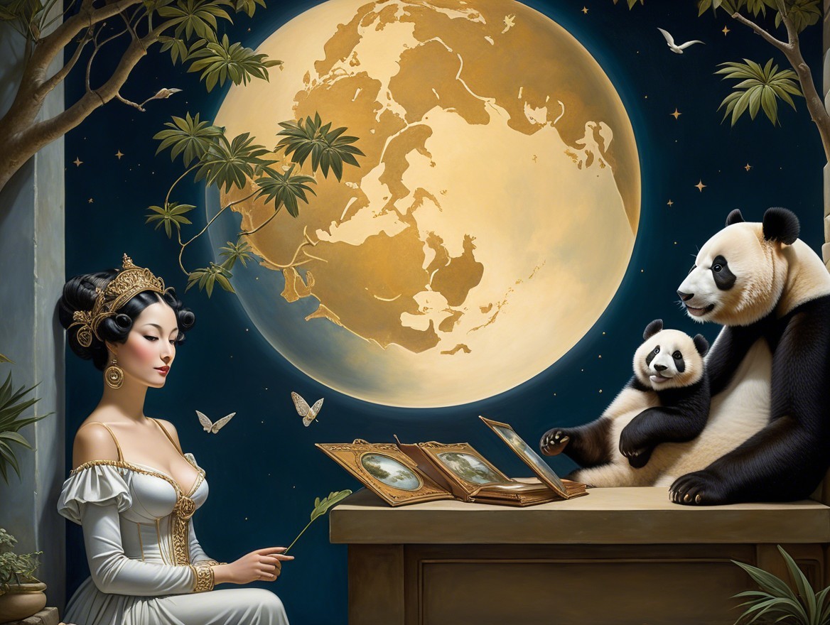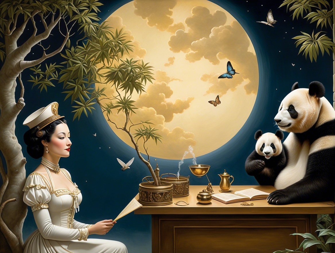 In a dreamlike scene, a woman in a white dress reads, seated at a desk. A panda beside her, engaging with books, overlooks a serene landscape framed by a circular window filled with birds and hills.