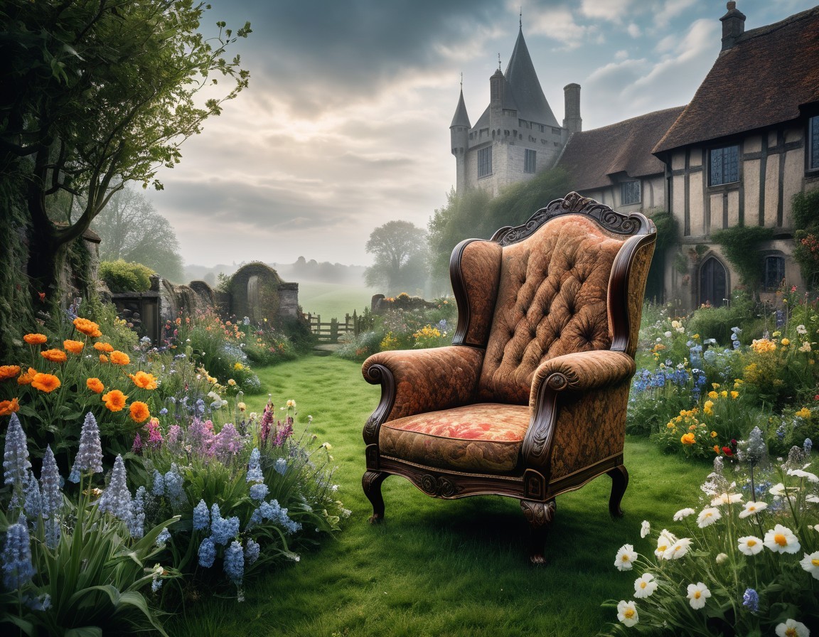 A vintage, tufted armchair sits in a lush garden filled with colorful flowers, framed by a picturesque cottage and rolling hills under a serene sky. A tranquil scene of nature and elegance.