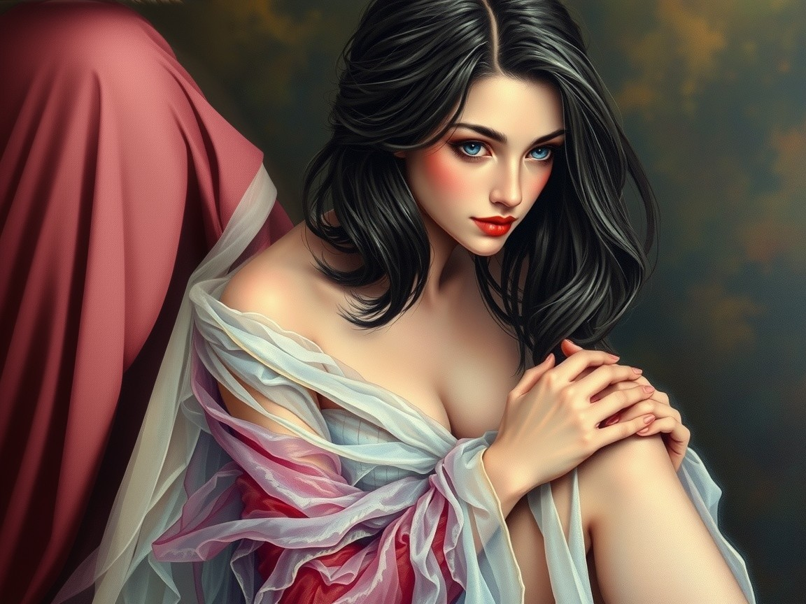 Prompt: Oil painting of a beautiful fantasy celestial being wrapped in cream colored romantic gauze gown, smokey brown eyes, long flowing hair, red lips, smiling and thinking of her lover. She is the only subject in the painting. Behind her a bare wall with green and gold brushed wallpaper, making the figure pop. Soft muted colors play off the fantasy and mystery of the overall theme. Tina Spratt style of sensual celestial romanticism. Warm candle light effect.