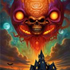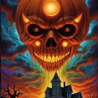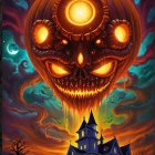 Eerie Blue Victorian House with Pumpkin Skull and Bats