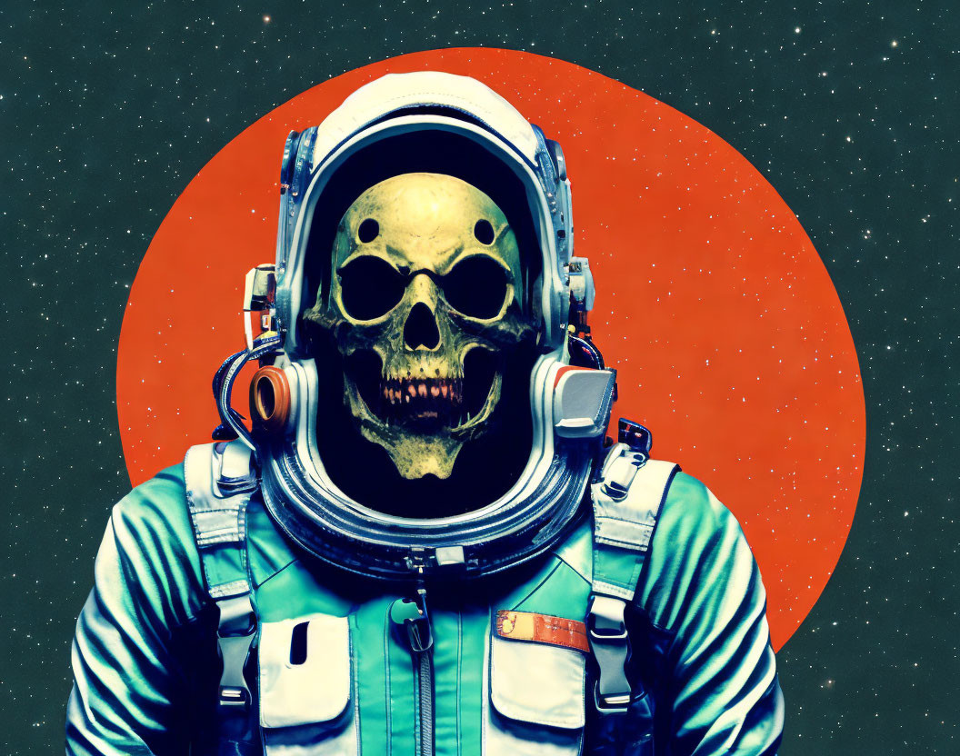 Person in spacesuit with skull face paint against starry space backdrop with red planet.