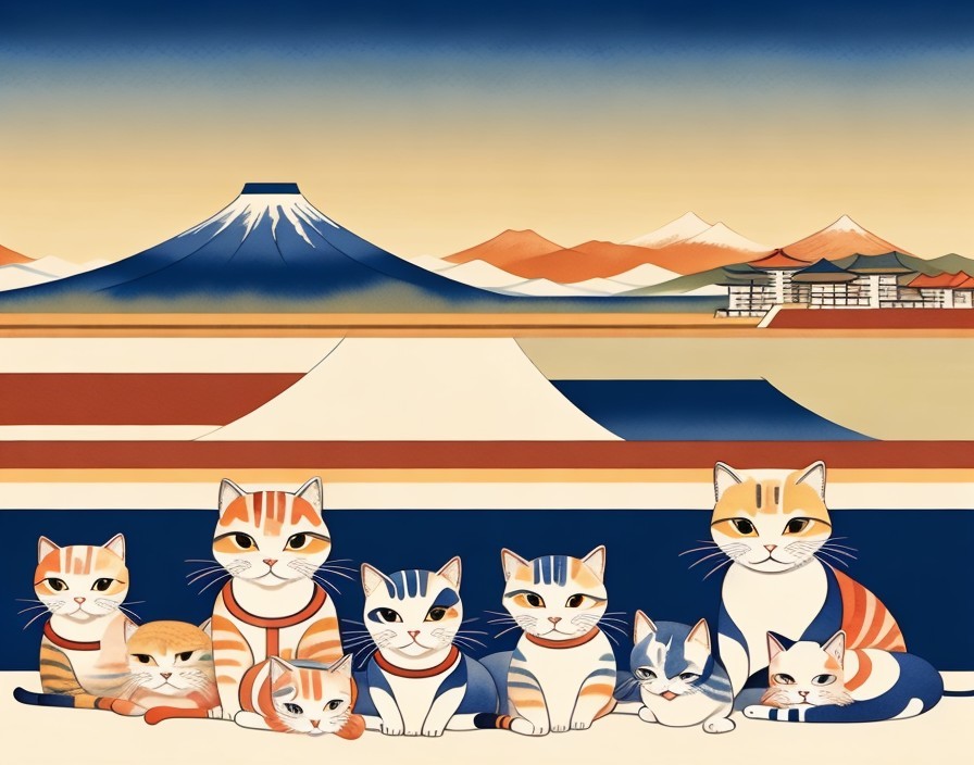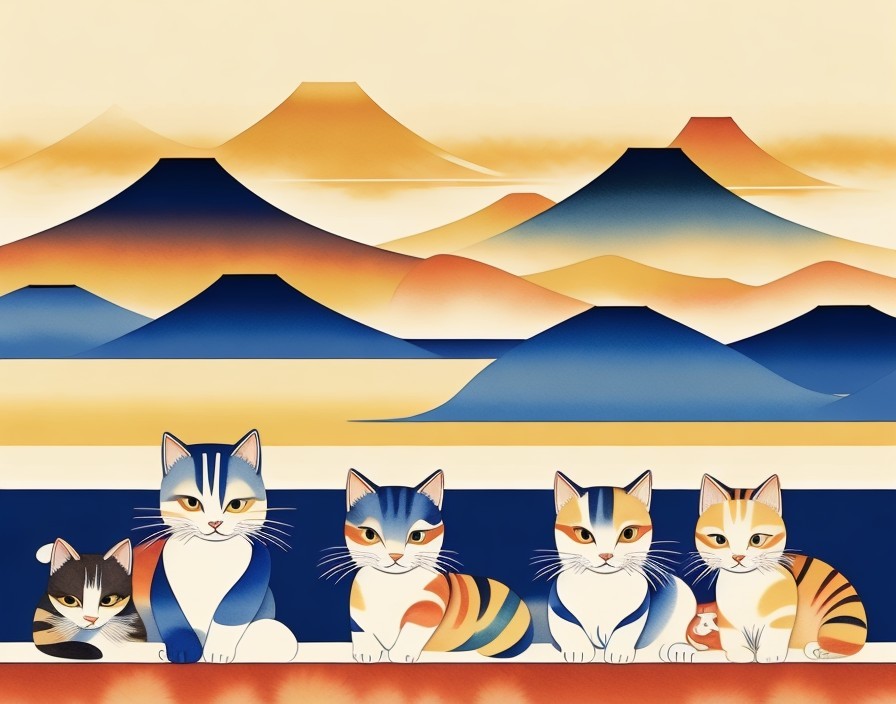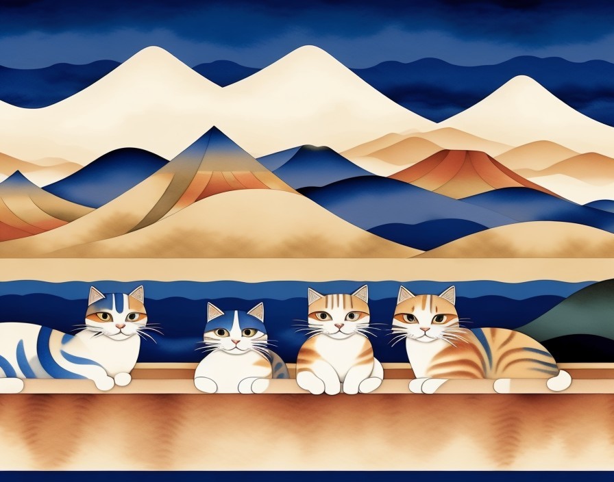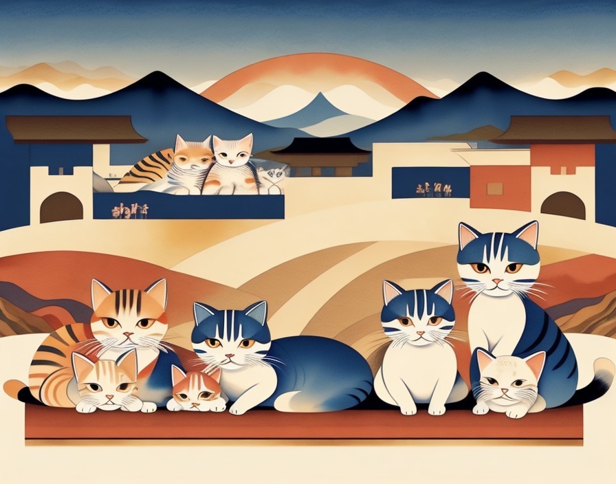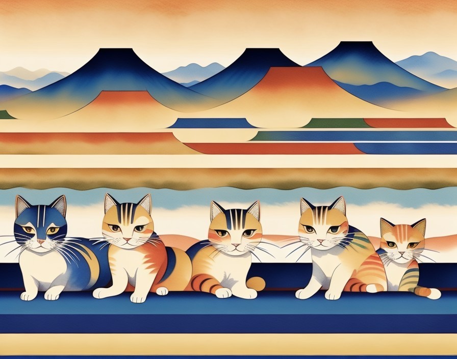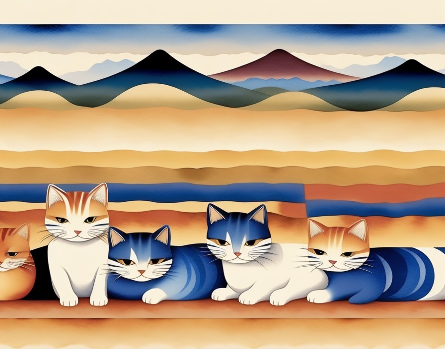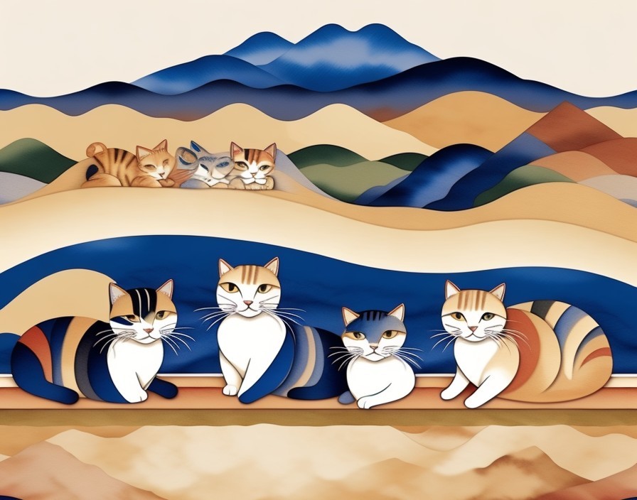 A watercolor and ink artwork, in the style of Japanese fashion 1520, naive painting, retro graphics mixed to Paul Klee cubist style, that features six gentle cats lying down on a modern furniture