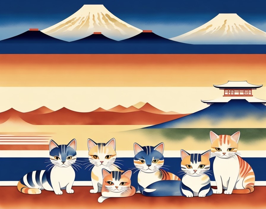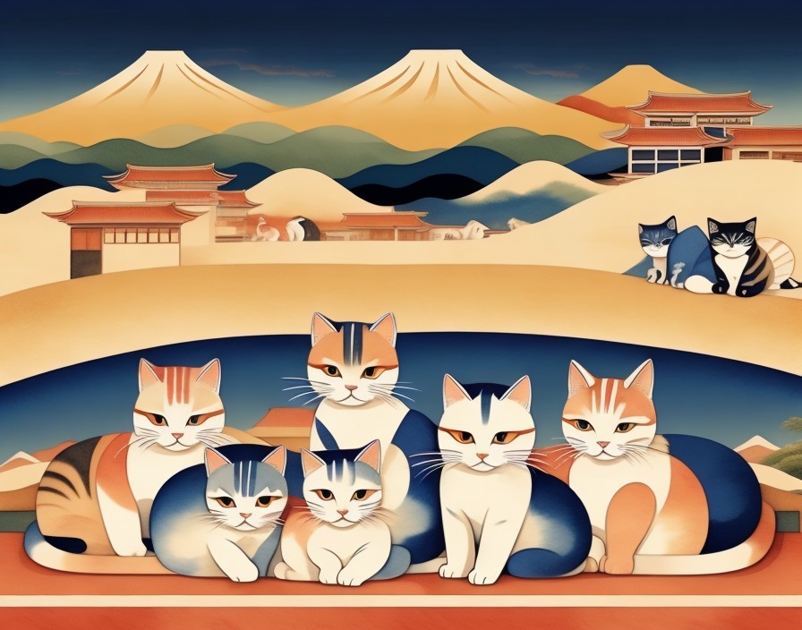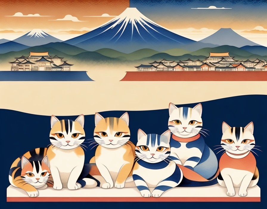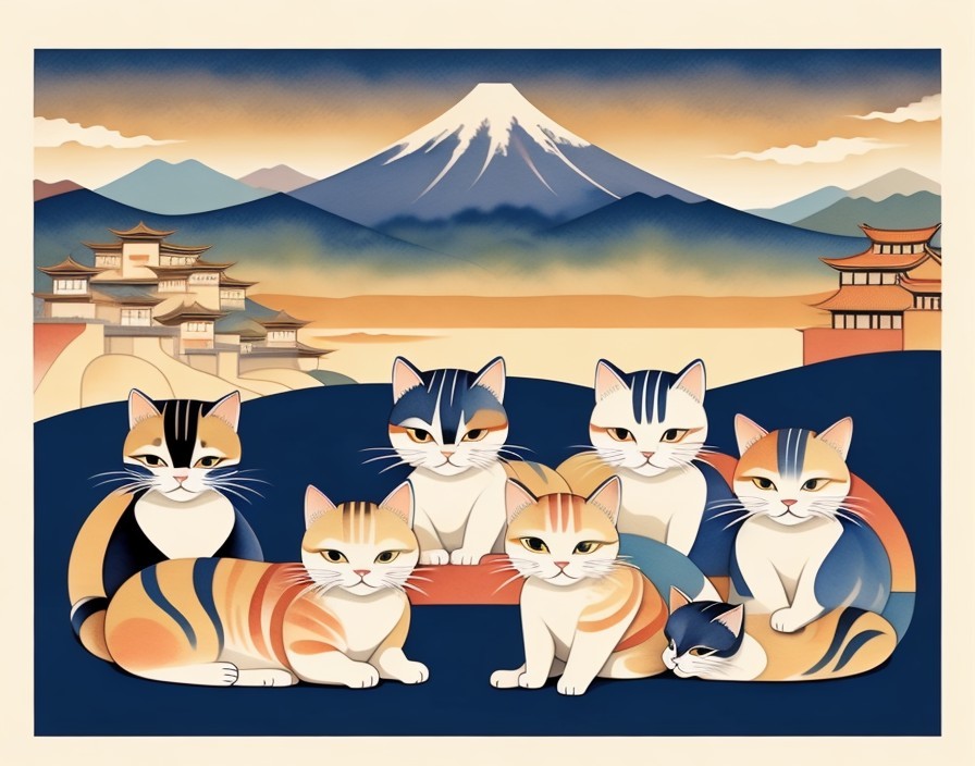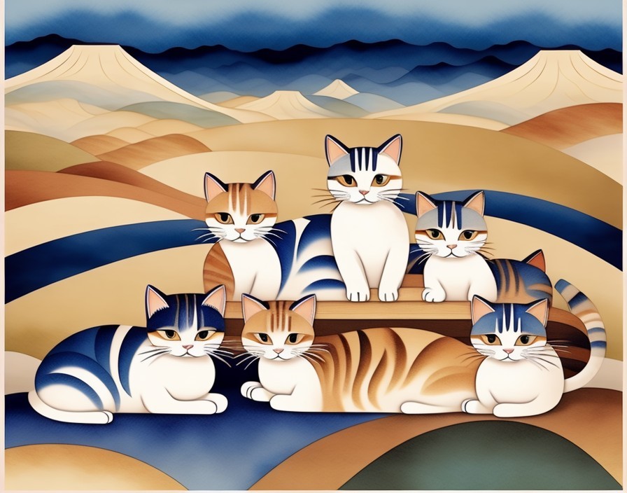 Prompt: A watercolor and ink artwork, in the style of Japanese fashion 1520, naive painting, retro graphics mixed to Paul Klee cubist style, that features six gentle cats lying down on a modern furniture