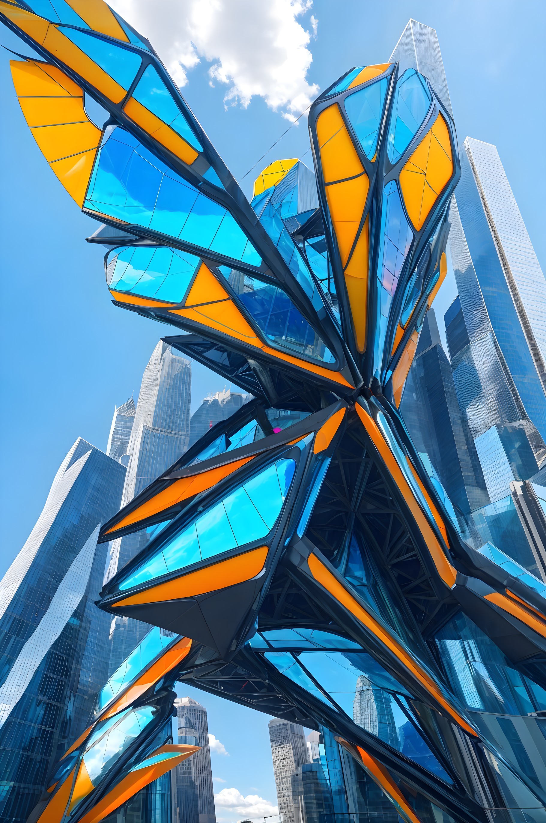 A futuristic sculpture with orange and blue panels against a backdrop of skyscrapers and a clear sky.