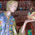 + Prompt:3d, encaustic, wax, portrait in half-relief of a blond middle-aged man with a curious look, wearing a shiny, colorful patterned blouson, smiling slightly, happily holding a small, flapping bird in his open hand, he stands in front of an old weathered brick building in front of the arcades, on the high ledge sit more colorful birds, detailed cross-hatching, in the style of John Blanche