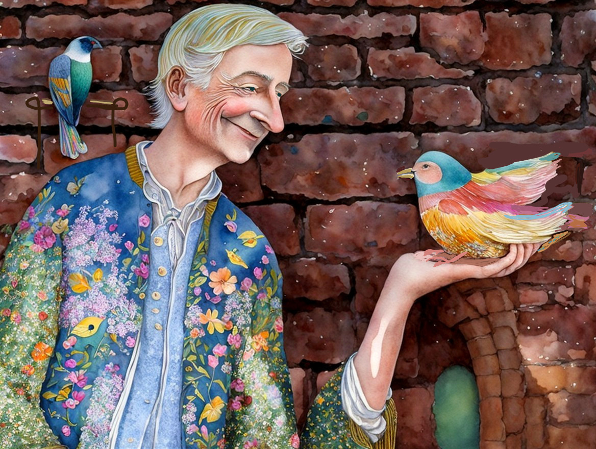 Prompt: A Children’s book watercolour ink outline illustration by Quentin Blake and Dee Nickerson, portrait in half-relief of a blond middle-aged man with a curious look, wearing a shiny, colorful patterned blouson, smiling slightly, happily holding a small, flapping bird in his open hand, he stands in front of an old weathered brick building in front of the arcades, on the high ledge sit more colorful birds, detailed cross-hatching, in the style of John Blanche