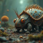 A whimsical creature blending a turtle and dinosaur traits, with vibrant orange spikes and large, expressive eyes, explores a lush forest filled with colourful mushrooms and delicate flowers.
