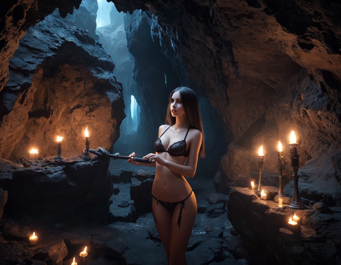 A woman in lingerie poses in a candlelit cave, exuding a mysterious and alluring ambiance.