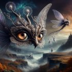 A majestic owl with intricate patterns spreads its wings in a mystical landscape. Fairies flutter around a distant, enchanted castle beneath a cosmic sky filled with stars and planets.