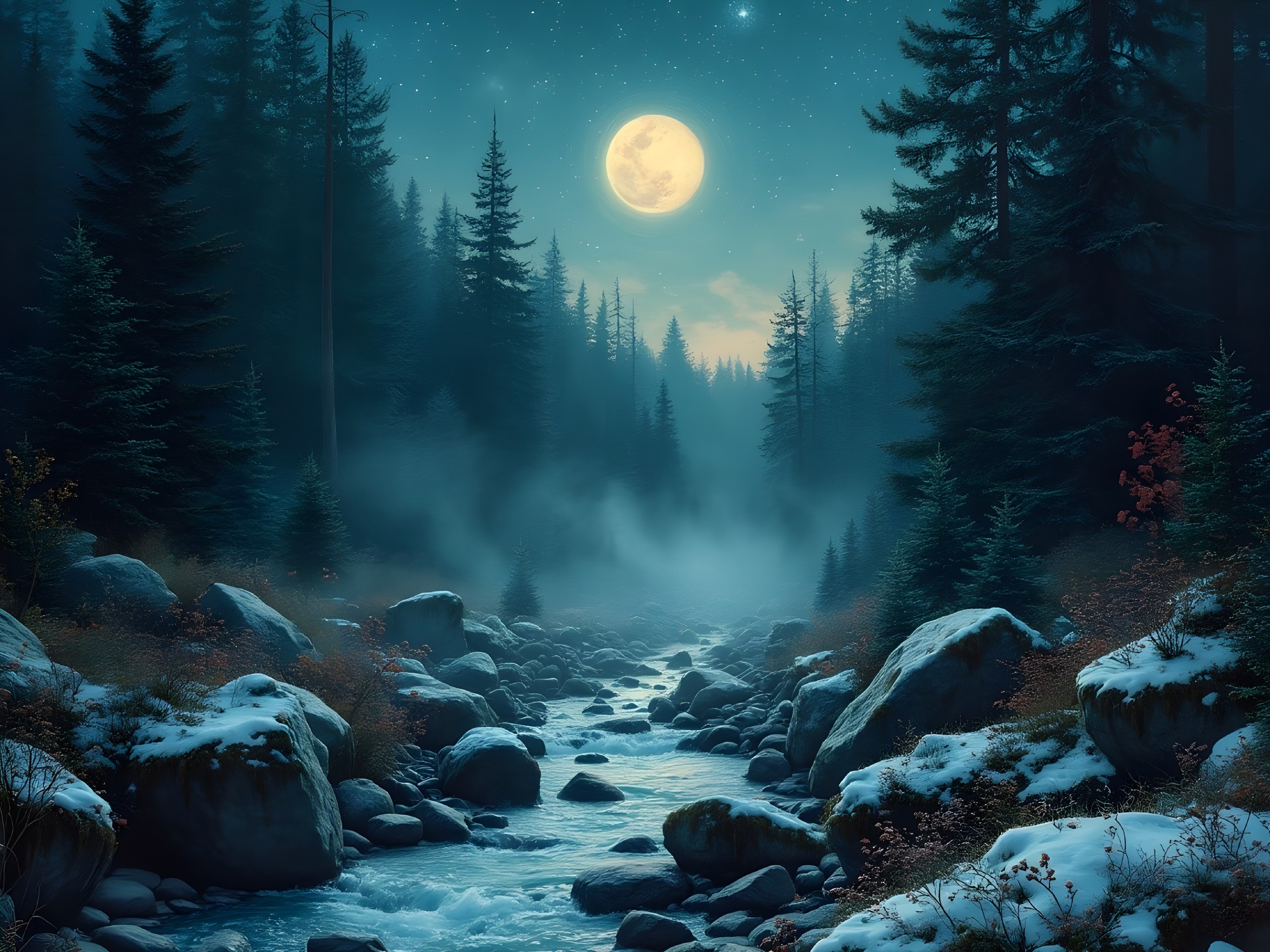 A serene forest scene under a moonlit sky, featuring towering trees and a gentle stream. Mist rises among the rocks, creating a mystical atmosphere illuminated by the soft glow of the moon.
