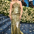 A glamorous figure in a sparkling green gown with intricate beading, looking over her shoulder at a bustling event, surrounded by photographers and elegant guests in formal attire.